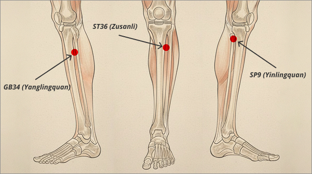 Стимулиране на акупресурни точки ST36, SP9 и GB34